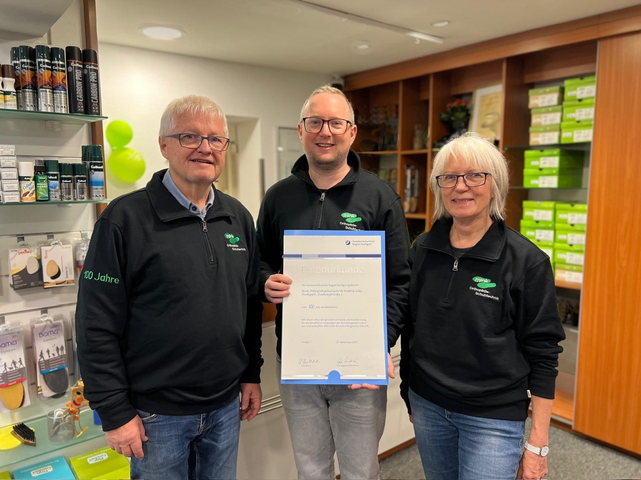 Seit 1.1.2024 ist Marian Mink Geschäftsführer der Mink Orthopädieschuhtechnik. Im Beisein der Eltern, Günter und Claudia Mink, erhielt Marian Mink die Ehrenurkunde der Handwerkskammer Stuttgart.